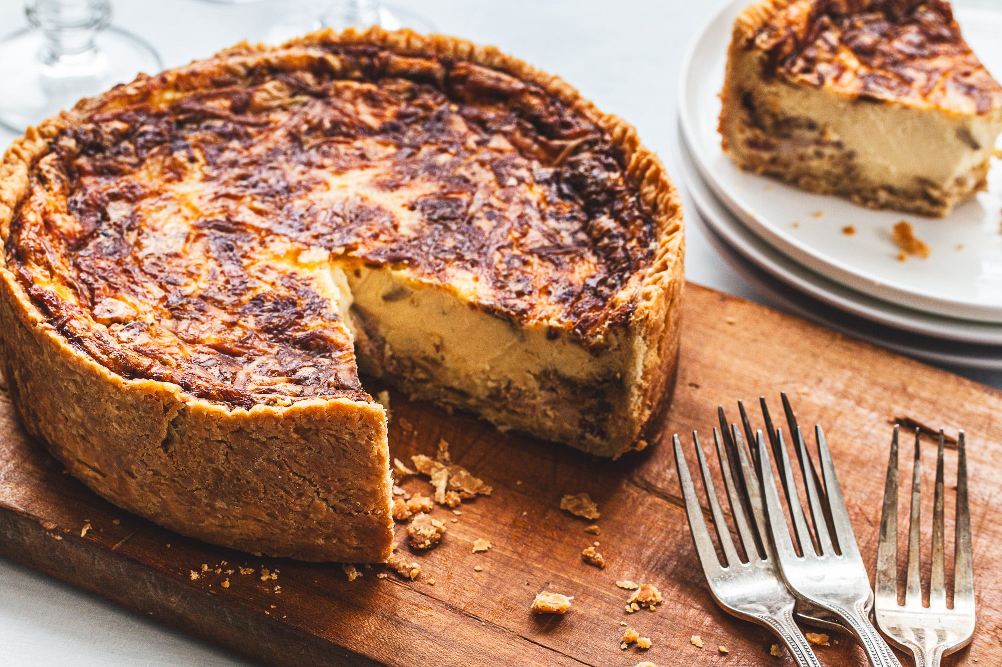 The impressive height of their large pies intrigued me, and I set about trying to more or less duplicate one. This is my Lorraine version of their tall, creamy quiche, baked in a springform pan with meaty strips of bacon, Gruyere, and onion. Its height makes it regal and party-worthy for a brunch or a supper buffet. Because of its depth (the filling takes six eggs and 3 cups of cream), this quiche takes longer to make than a traditional savory pie, but it's mostly hands-off time.